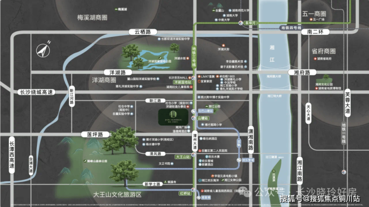 直线距离约850米直达湘江沿江风光带,近邻约6000亩洋湖国家湿地公园、约1200亩巴溪洲公园、约3800亩大王山森林公园、约7100亩伏龙山、约2000亩狮峰山,城市与自然随心切换。