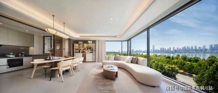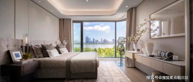 建面约143m²IMAX巨幕观景台,约16.2米观江面,极目长江磅礴; 超尺度转角光幕环厅,客厅、餐厅、厨房、阳台一体化设计;瞰江创想空间,定制更多生活场景;东南向卧室,全家庭舒适生活私域。