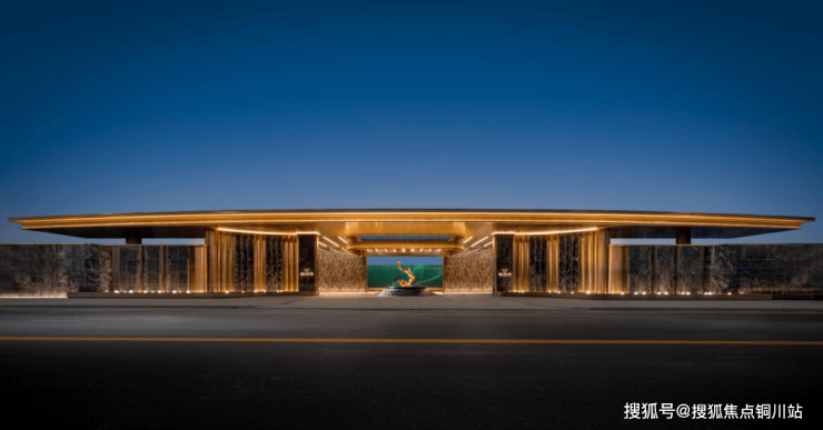 在社区大门打造上,越秀更是豪掷千金。前有“超宽领域归家大门“——58米宽、6.4米高的会所南大门惊艳市场,顶级爱马仕灰色大理石搭配香槟色金属,景墙立柱圆弧收边,立于两侧黑金沙花岗岩水景之上,尽显雅致气韵。后有70米宽、7.2米高的社区东大门再度超越。东大门景墙采用意大利灰石材、大花绿奢石与复古香槟金金属线条衔接,门庭采用香槟金外弧穹顶设计,融合龙鳞纹雕琢的中心环岛水景与现代雕塑的相得益彰,既形成强烈的视觉昭示性,又通过光影交叠的立体景观序列,实现从城市界面到私密社区的渐进式过渡。