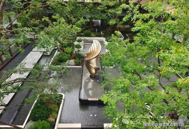 下沉式庭院以水景为底色,再配以特色树种、艺术雕塑、水间步道等,极为惊艳。