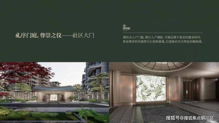 整体南北分区造园,北为洋房南为合院。分三进礼仪入园:一进礼仪门厅,二进天地院落,三进生活雅院,并设九处融合了诗意东方的园景融汇于三进,打造东方礼序归家。