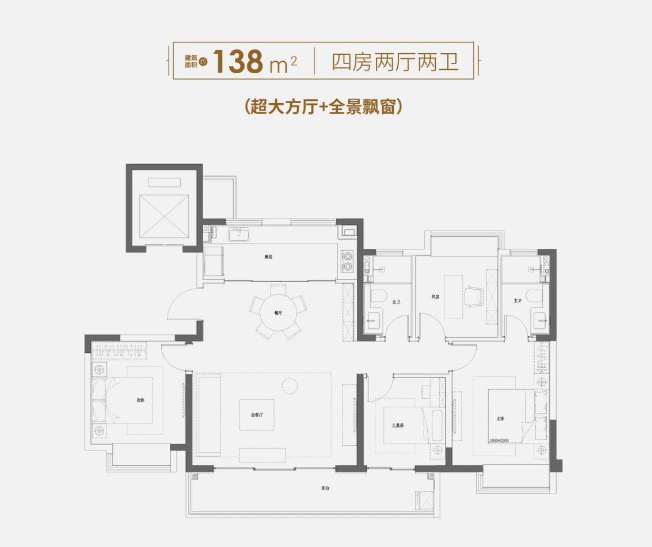建面约138㎡,4室2厅2卫设计,更大的面积,意味着更大的尺度和更大的舒适度,四开间朝南+南向双阳台,带来与众不同的采光体验和景观视野。
