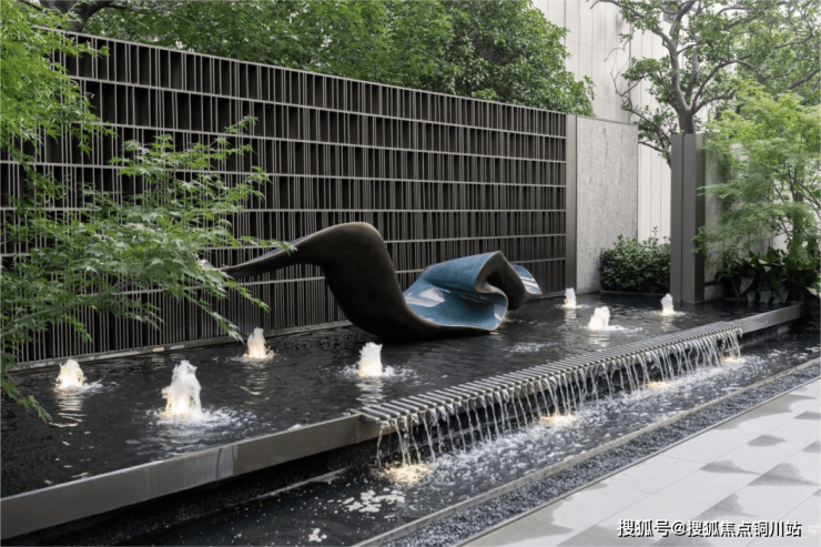 通透的格栅景墙以其轻盈的姿态,将光影切割成诗意的片段,引一江水蜿蜒其间,水悄然流淌,与水流般的艺术雕塑相映成趣,似一曲悠扬的旋律,引领着视线与心灵一同流淌,仿佛时间在此刻也变得柔软而富有诗意。
