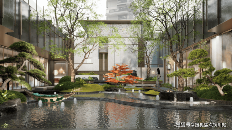 庭院设乌篷船艺术雕塑,池底铺彩色陶片(黑、青、橙),橙色如游动锦鲤,寓意吉祥。植栽以点景乌桕、特选红枫与羽毛枫为主,结合色叶花境,延续婉约氛围(乌桕喻多子,红枫喻希望,羽毛枫喻繁荣)。庭院被连廊及建筑环绕,形成“四水归堂”格局,象征聚财,雨后尤显江南韵味。