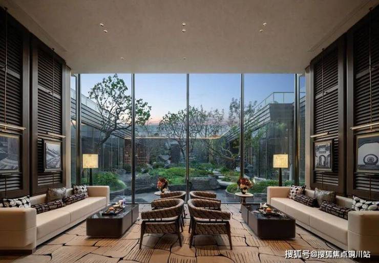 比如绿城明月兰庭,无论在健身房或瑜伽室,还是在会所会客,透过整面的巨幅落地玻璃,下沉式庭院的叠瀑、树影、奇石等都被自然地引入室内。