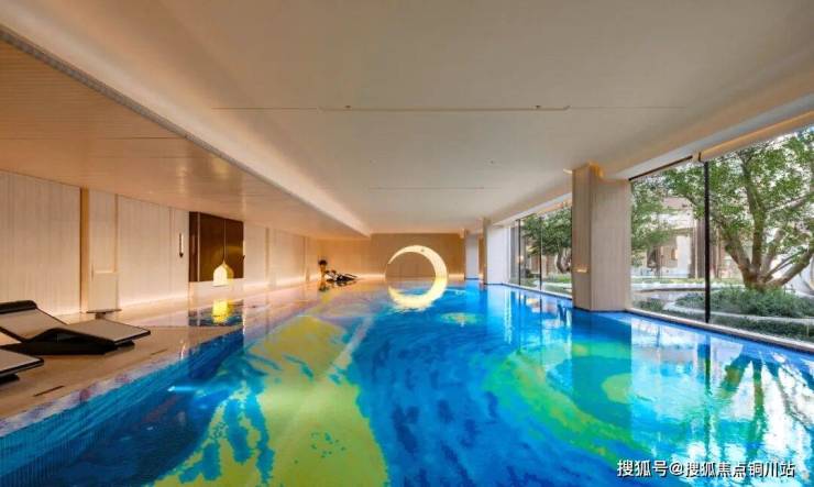 天曜序的恒温泳池更像是一个艺术馆,还原梵高名画,墙上映出一个月牙形的月亮,与水中的倒影拼成一个满圆的全月。