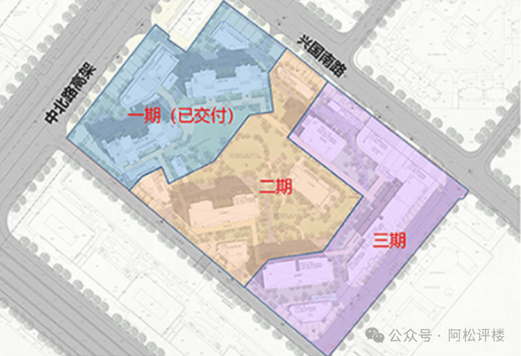 项目分期示意图显示,一期1、2号楼已交付,6号楼为二期,2024年曾拿证但被限制销售,并未实际对外出售,三期则是3-5号楼。