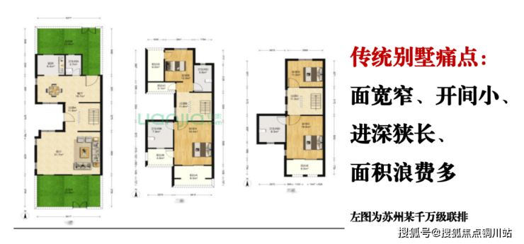 例如,往常市面上小千万级的联排产品户型,虽然整整三层,但长进深,短面宽的设计,通透性较差,面积浪费过多,室内采光面少得可怜,体验感视觉感较差。