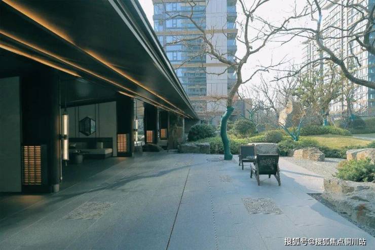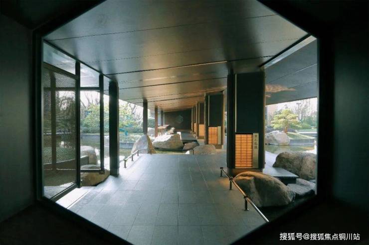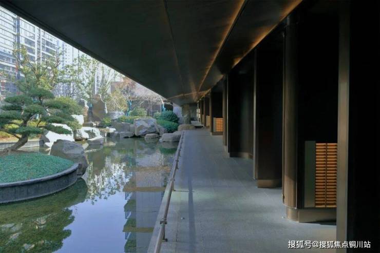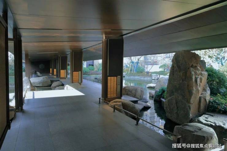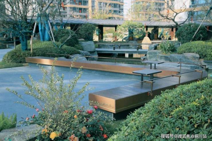 约 978㎡中心水景蜿蜒成 48m 特色水廊,水波荡漾间呼应《春江花月夜》中“春江潮水连海平”的悠远意境;