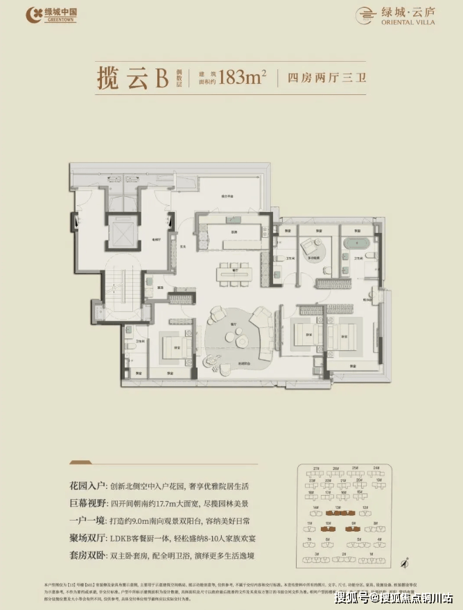 183㎡四房,超豪华约17.7米南向巨幕视野,约9米南向观景双阳台,还有LDKB一体化,容纳8-10人聚餐不成问题,双卧套房配全明卫浴+衣帽间改善。