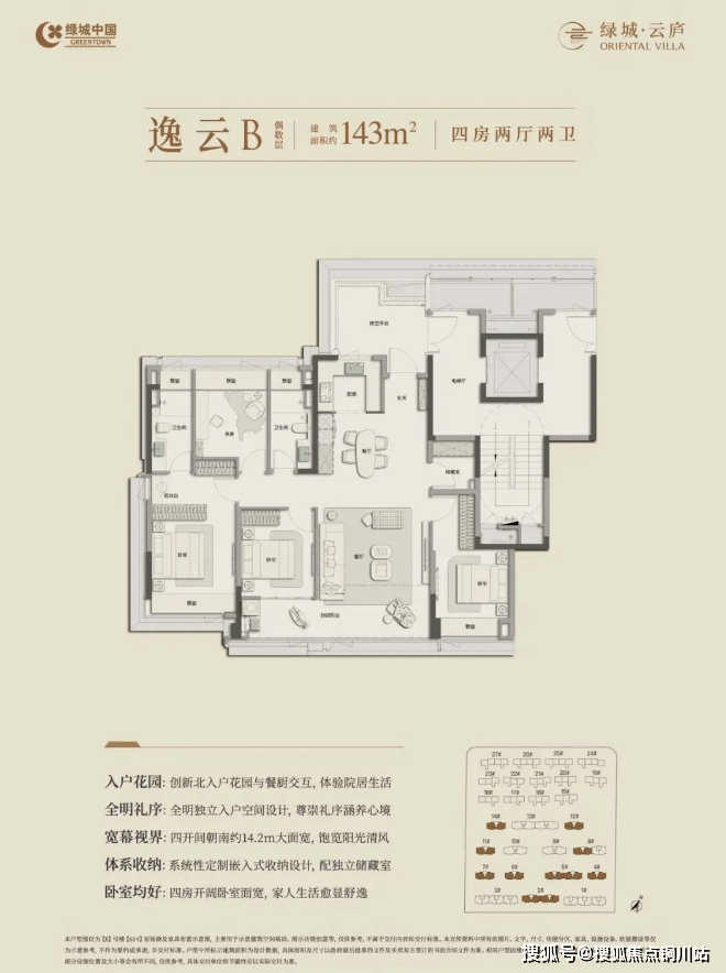 此次曝光的是7F四代洋房户型图,共6个,全部做了全明独立入户空间、南向双阳台、除了南向大面积挑空平台,还创新北侧空中入户花园,独立餐厅、主卧(双卧)套房、全飘窗(不连接阳台或露台的卧室、卫生间、书房)等设计。