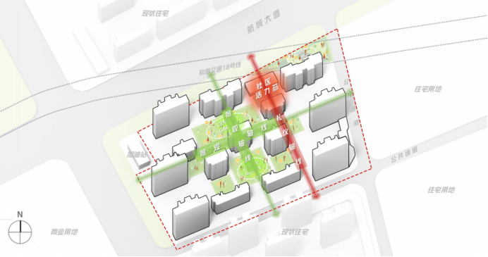 功能设施上考虑到全龄活动需求,全天候、交互化为核心功能,整个社区结构以“三轴、两园、一芯”方式呈现,同时兼顾归家动线与日常娱乐需求