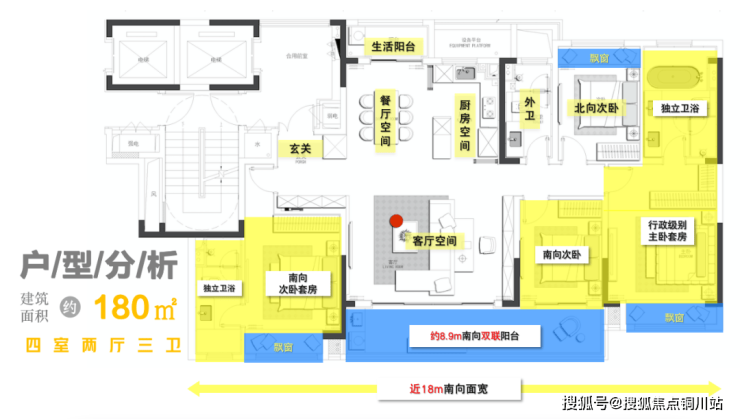 建面约180㎡ 的终极改善户型为4房2厅3卫的设计,五开间朝南,南向开间达到了惊人的近18m;