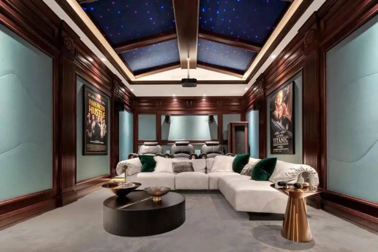 休闲区的陈列调性将居住者对文化的沉淀和延续展现地淋漓尽致,空间处处流转着中国传统文化的博学与意境。夜空中繁星与月亮舒卷涌动,进入家庭影院,幕布里是跌宕起伏的剧情,幕布外家人围坐,跟随剧情情绪起伏,或紧张或舒缓。