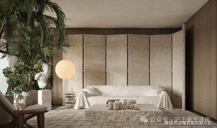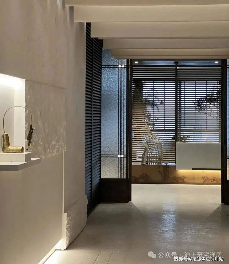 约9米净高的门廊尺度顶部挑高,南北向礼序轴与东西向精致生活轴交织形成十字转场,整个归家礼仪,在这里升华至顶点。