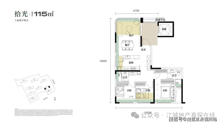 建面约115㎡,三房两厅两卫。