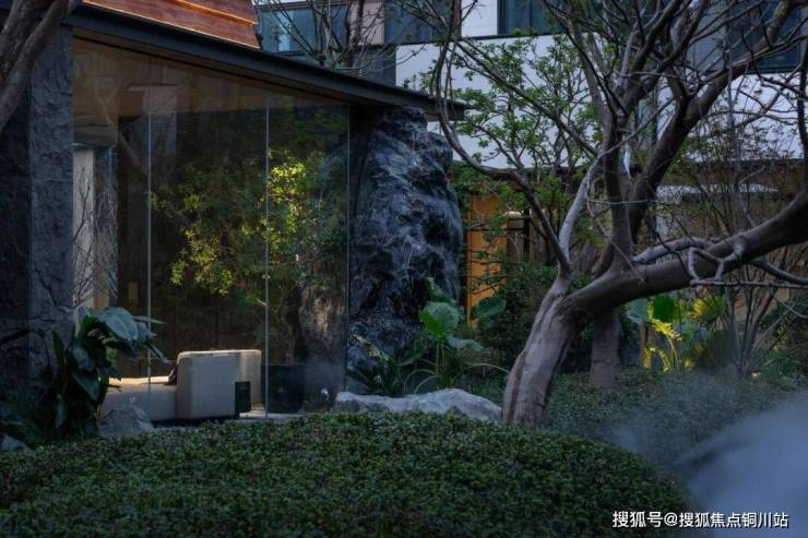 售楼处实现了两面望景的开放状态,两侧各设围合与半围合形式的小乌桕林院,线性弯曲的乌桕树打破了实感的盒子空间,映现出虚实相生、静谧安宁之境。