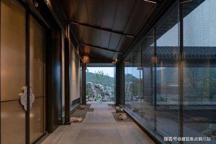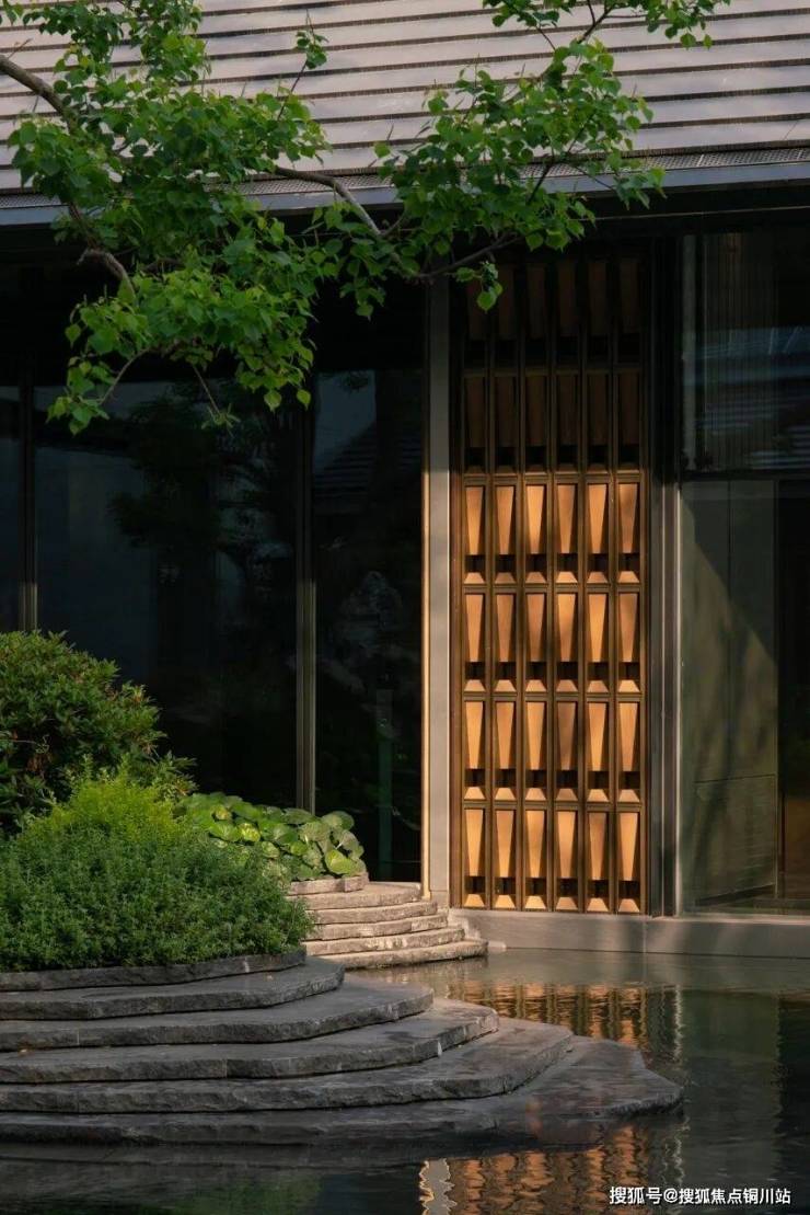 游廊设计灵感源自无锡寄畅园的“清蘌回廊”,廊墙之上开凿圆形墙洞,水底以宋代米芾《研山铭》为蓝本,采用白玉嵌金工艺铺就,既传承了文人赏石的雅致传统,又通过现代技法赋予水景金石韵味,负阴抱阳,虚实相生。