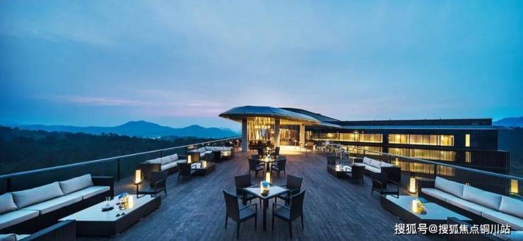 酒店楼顶的经纬线露天酒吧,可俯瞰整个桃花源山景(据说这个最佳观山高度,是绿城创始人宋卫平先生亲自爬上脚手架选出的)。