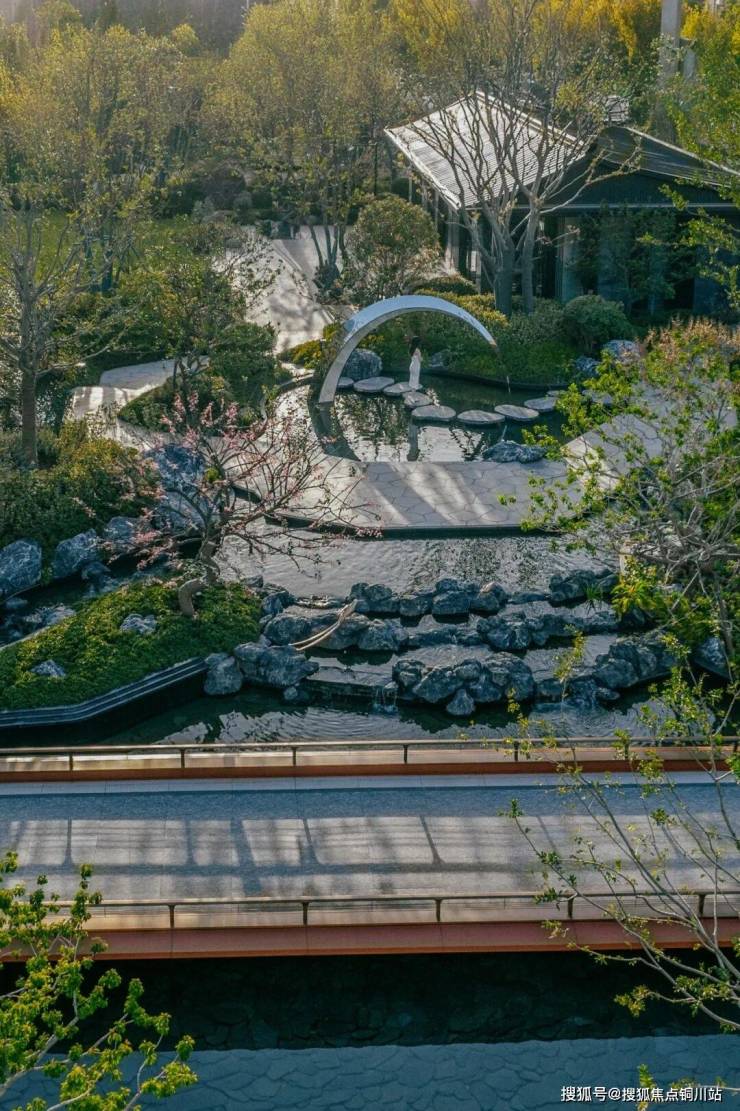 结合中式园林置石、跌水、曲径与绿化作为细节点缀