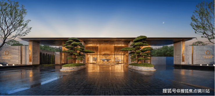 社区主入口“凤起冕旒”,以约85米长的门廊构建出强烈的归家仪式感,材质上融合金属、石材与手工景泰蓝细节,内檐叠瓦与嵌入式光带的设计,使建筑能随自然光景呈现不同氛围。
