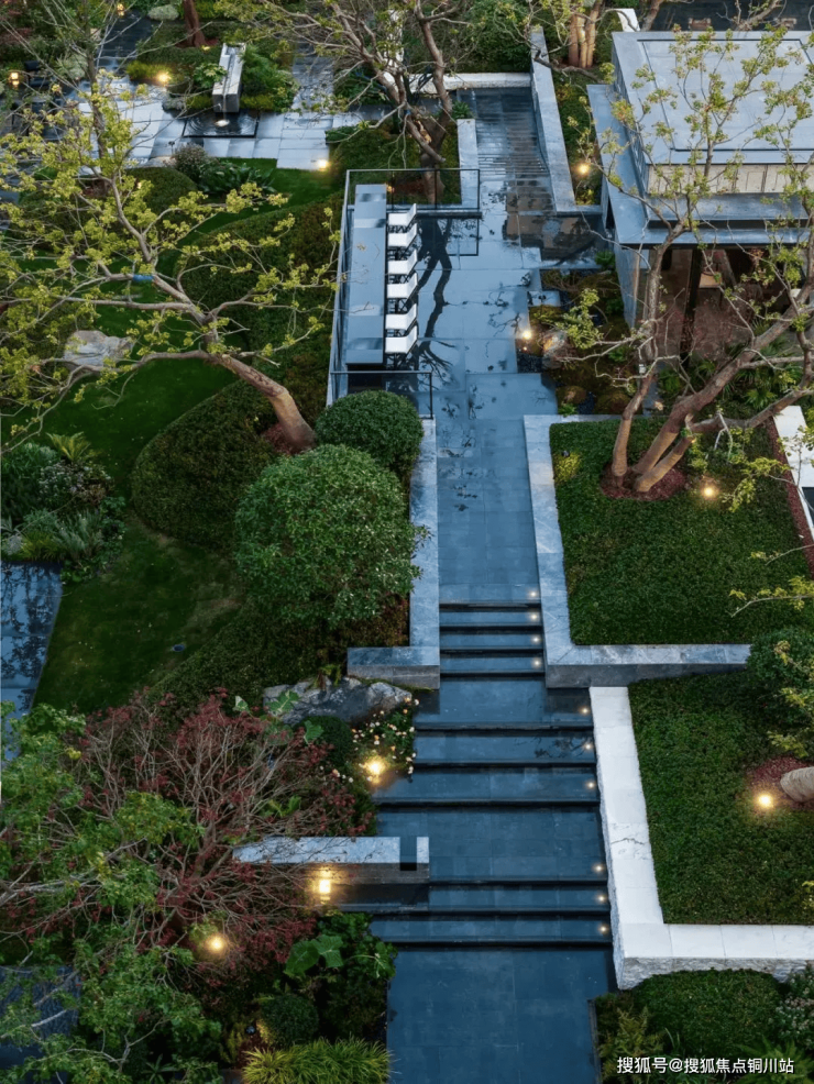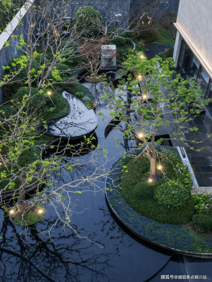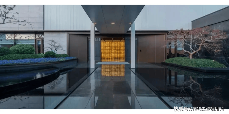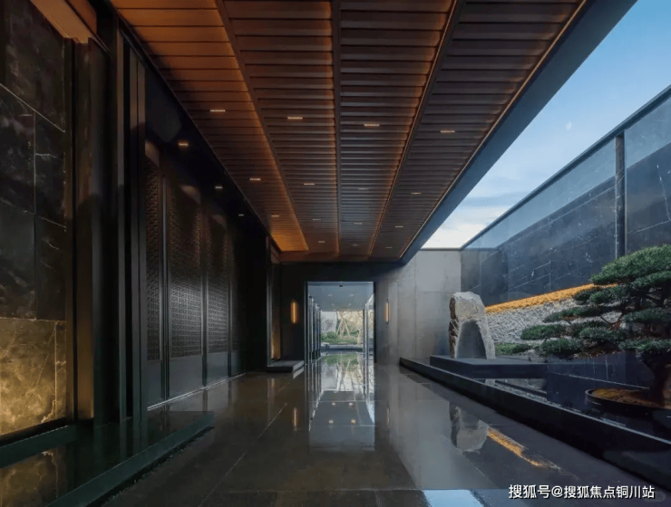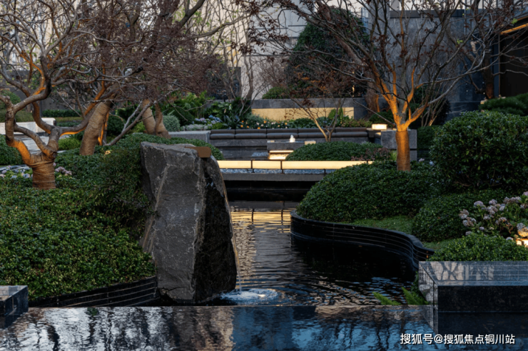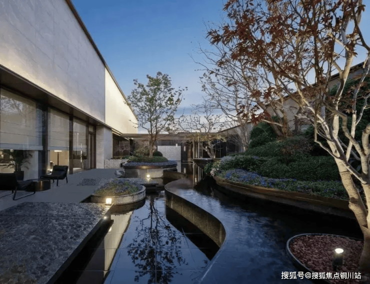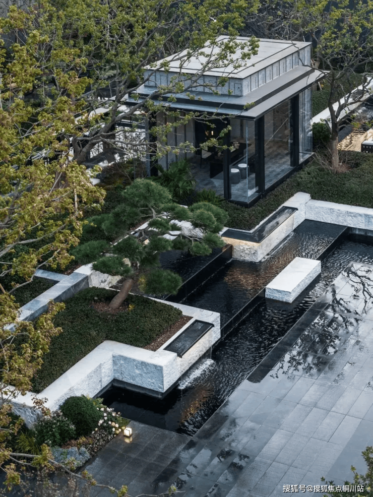 流畅迭起的跌水,荡起连绵波纹,以其自然的轮廓,抚平心灵的喧嚣。透过窗棂,框取一幅自然画卷,水木交融,光影交错,乌桕与红枫交相辉映,潺潺石泉旁,重塑现代生活中的“湖光山色”。