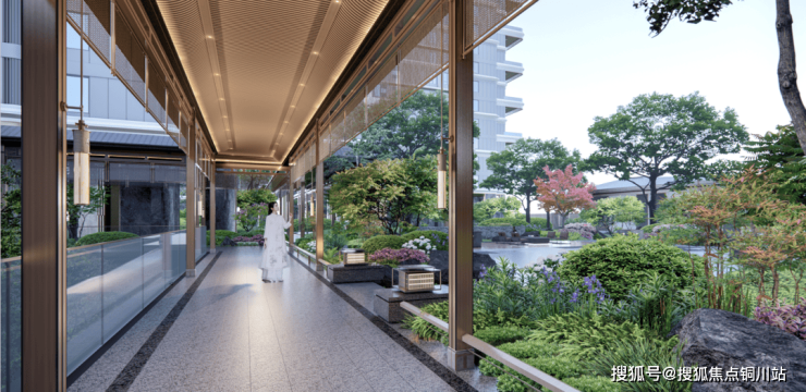 值得一提的是,该项目风雨连廊宽度可达约3.5米,空间阔绰,穿过风雨连廊,也能遍赏小区内的绝美园林景观。