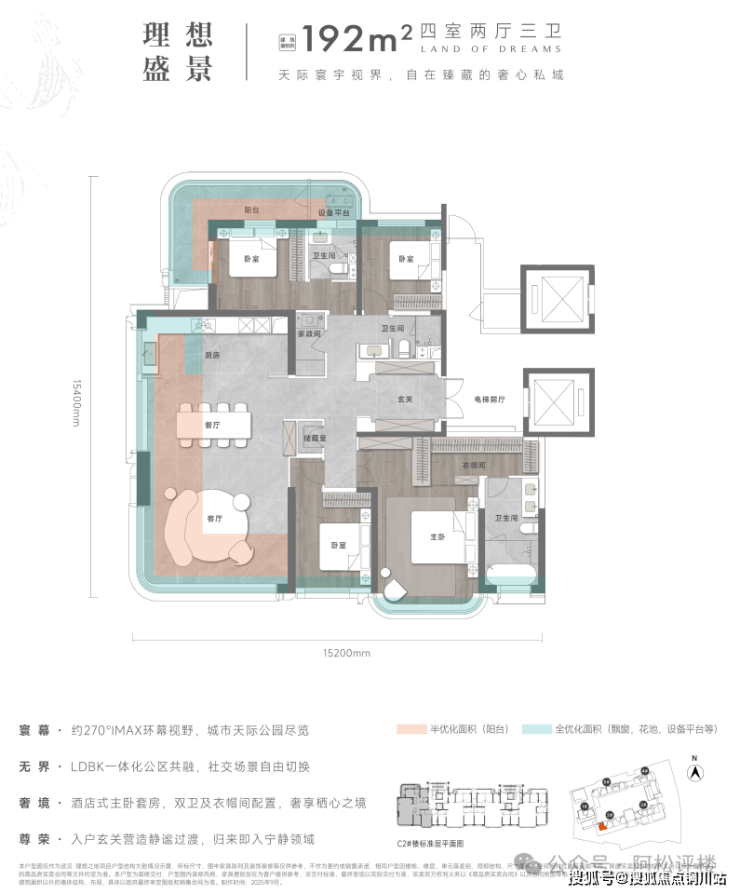 空间尺度上:此户型做到了真正的三面采光,南向约15.2米采光面,采用大量全景落地窗,LDBK一体化动区的转角弧度阳台,不仅空间阔绰,环幕采光视野更是一绝;北向套房被阳台环绕,实现极为霸气的270度视野。