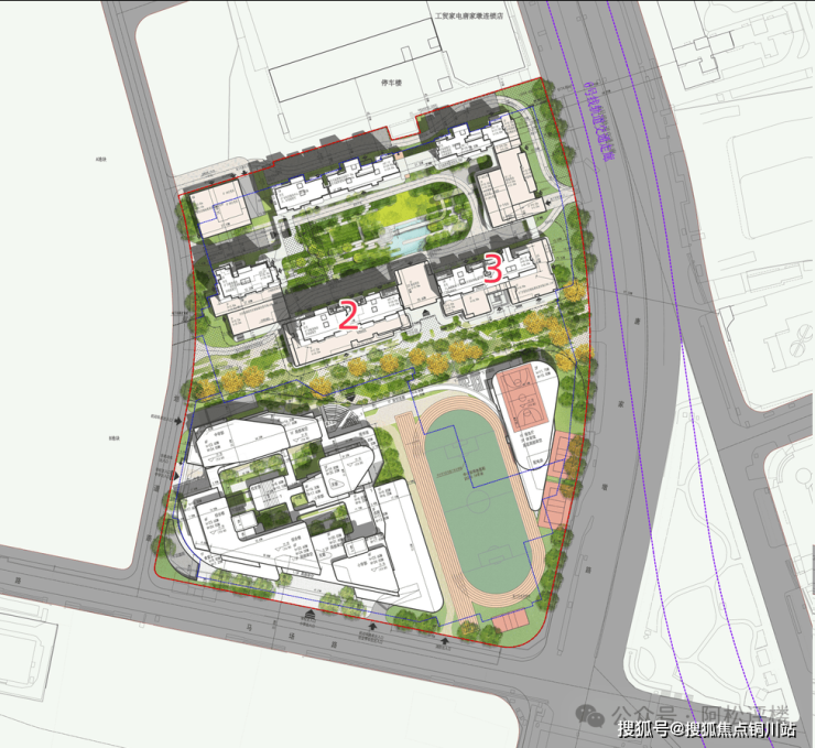 2、3号楼南侧紧邻规划的九年制学校,对视野采光影响很小,且楼下就是学校,还能实现真正的目送式教育;南侧的高线公园、北侧的小区中央景观,都让2、3号楼的视野景观极好。