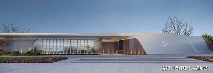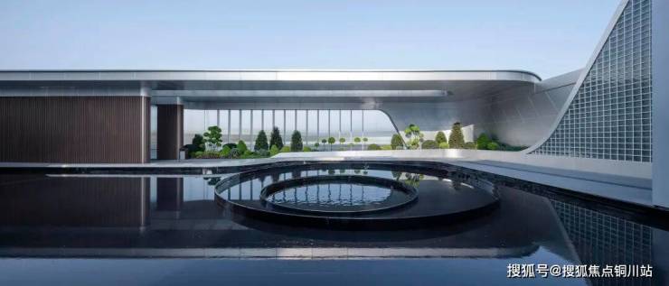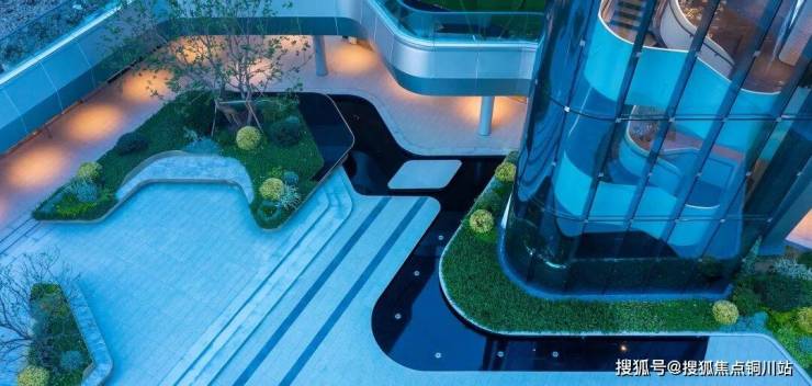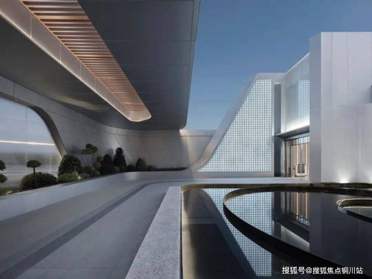 建筑体量延伸至室外下沉庭院,后场在前场及建筑造型的基础上加以演变,运用折弧线等流线性,营造出丰富且动态的后场景观。
