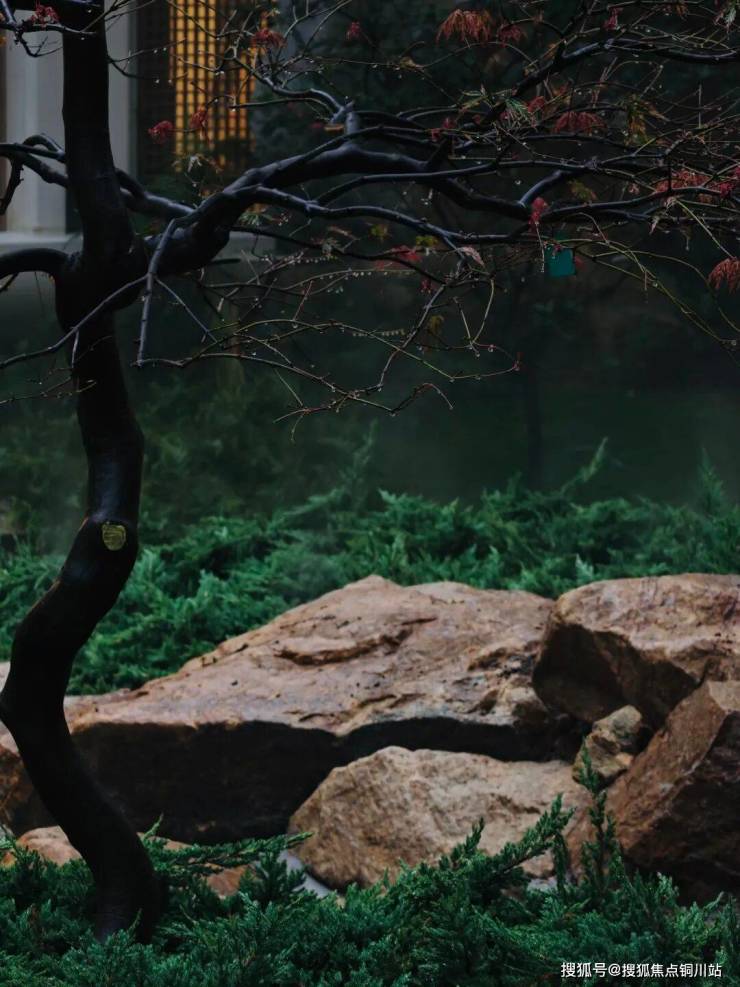 通过约7米的台地打造出「崂山野奢」在地景观,其中庭景观营造出崂山不同的意境:以老桩朴树、乌桕、羽毛枫为主体,构筑起错落有致的微缩森林;林下则以蕨类、翠云草等喜阴植物覆地,形成绵延的底衬。
