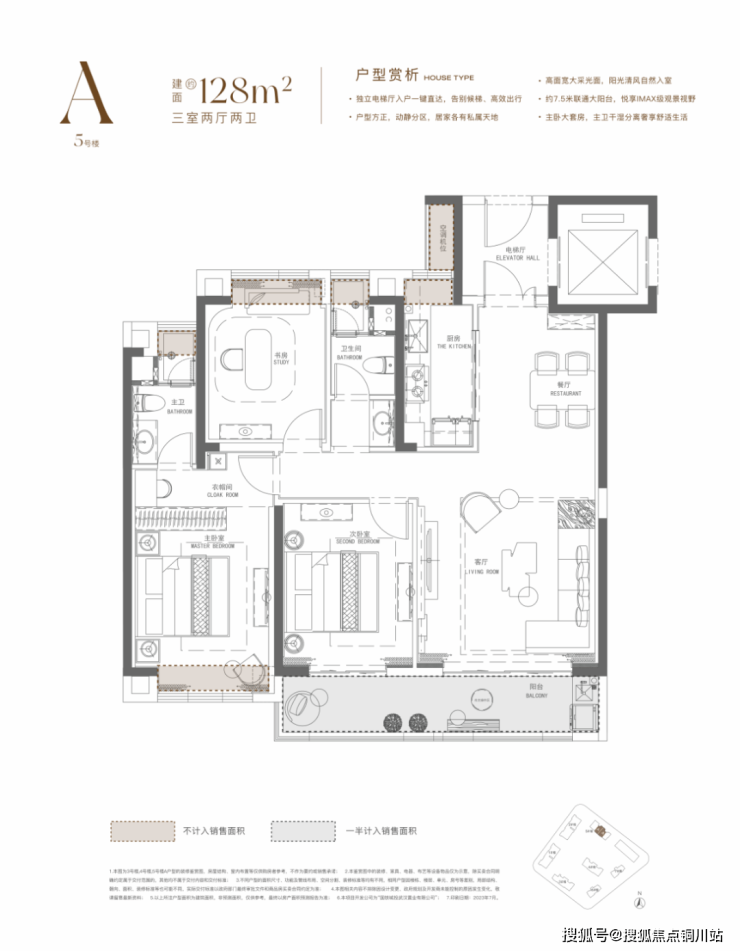 建面约128平户型,是中间电梯双开门设计,因此相当于是独梯独户大平层般的居住体验。
