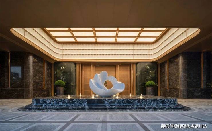 云石吊顶下,取古建藻井之法,以 522 片皇家白玉石材拼接凝光映景;中央水景托举艺术雕塑,莹润如宝。立面甄选铂金钻、墨绿荷塘月色奢石铺陈,配安哥拉黑奢石花钵与手工锻造巨幅铜门,质感温润尽显。