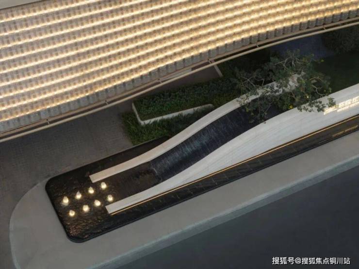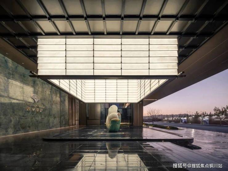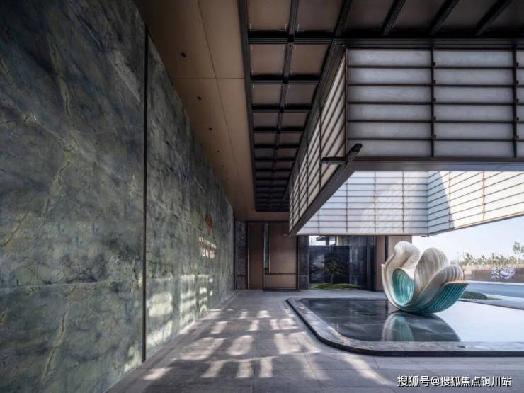 项目采用三进式礼序门庭。第一进,是约40米的气派头门,立体百合雕塑为核心,通过材质、光影、水景与绿植的巧妙结合,打造出礼序、灵动且富有艺术感染力的入口空间。