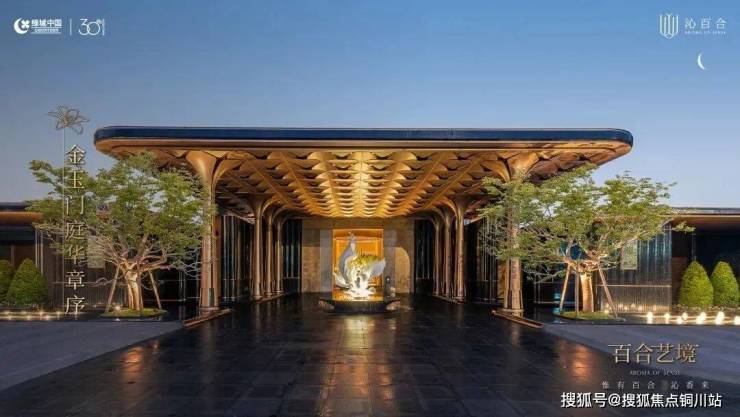 42 米超宽门庭气度不凡,8 根巨型花瓣柱阵列托起大尺度雨棚,200 余片百合花瓣锻造的金色吊顶下,百合雕塑熠熠生辉,玉石大门质感温润,百合元素贯穿始终,韵致独具。