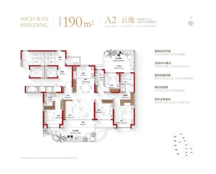 四开间朝南, 南向面宽做到惊人的16.5米,并且南向阳台宽约9.2米,采光面相当充足。拥有南北两座空中庭院,仅赠送面积就达到了 约33㎡。