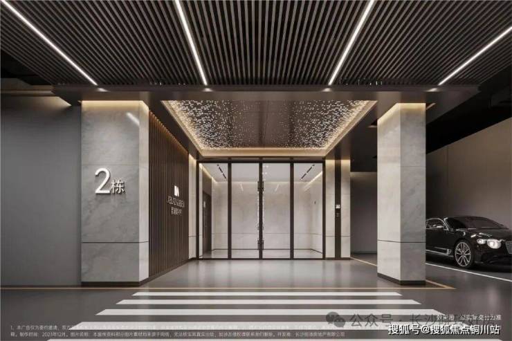 2.地库入户空间:光鲜的建筑立面是面子,而地库入户则是里子。璀璨学府地下车库落客区以铝板格栅搭配仿石材瓷砖打造星空归家路径,地下入户大堂及电梯间以石膏板吊顶+仿石瓷砖渲染温馨感。使业主在归家路上的每一分钟,时刻感受品质归家氛围