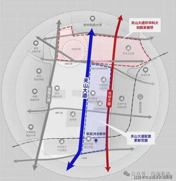 主轴纵横:两纵(关山大道、光谷大道)丨两横(关南园路、三环线)