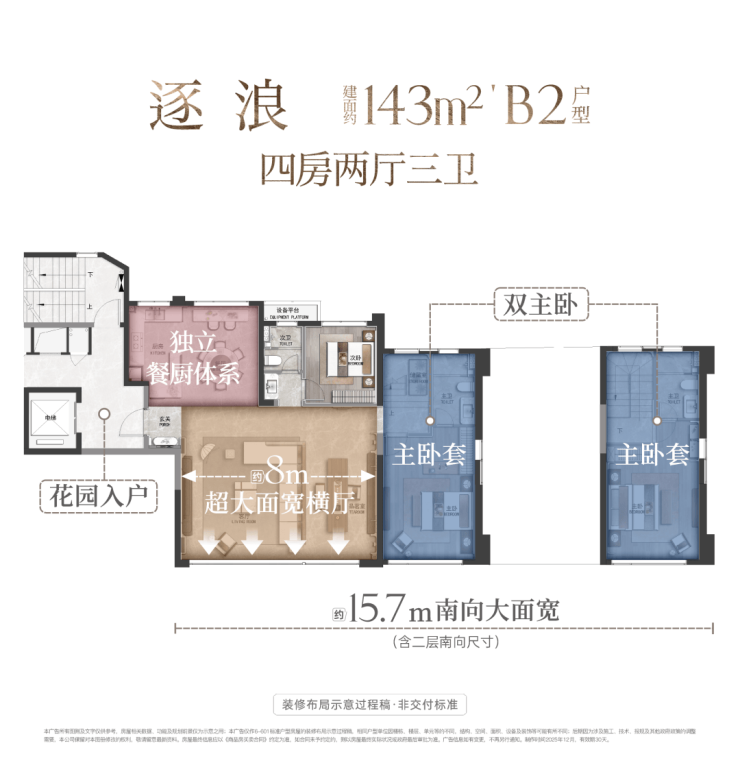 3明卫布局支撑多套卧设计,最多可打造3套卧,更享双主卧套房配置实现“代际平权”,让长辈与年轻人各享私密舒适;