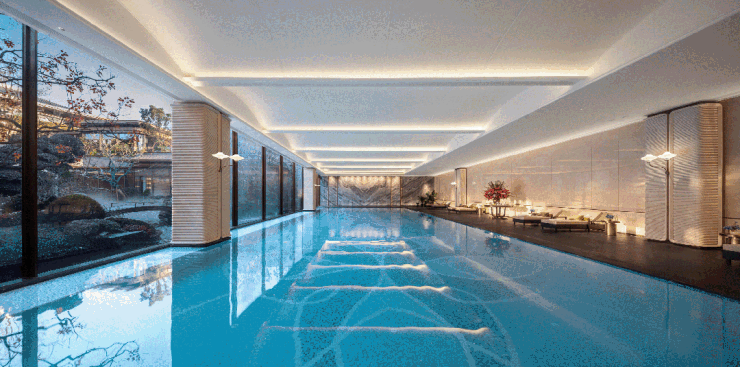 约1500㎡下沉会所更显惊艳,围绕叠瀑庭院“回”型布局串联四大场域:瞰景健身房运动的同时饱览绿意;恒温泳池搭配落引景落地窗自然畅游;18人位私宴厅配置茶室、棋牌功能满足高端宴请;清浅酒廊“日咖夜酒”格调雅致,高阶雅集生活提前呈现。