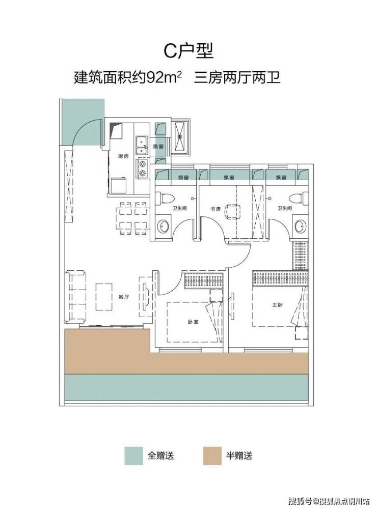 建面约92㎡户型产品打造三房两厅两卫,也可以改造为大横厅+主卧大套房,室内空间更具“成长性”和多变性,满足年轻小夫妻的高品质生活需求。