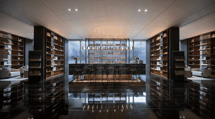 透过超大落地玻璃幕墙,下沉庭院的艺术诗境就闯入了眼帘。四水归堂的形制、一池三山与光影乌桕,就像一座漂浮在云上的现代艺术馆。