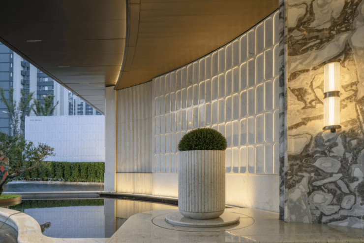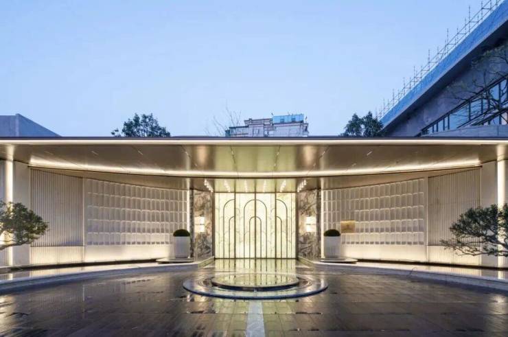 先看社区大堂:高门大院的直视感,社区主入口的设计灵感来自于上海华尔道夫酒店,石景墙上还雕刻有百合花纹,和项目案名相得益彰。