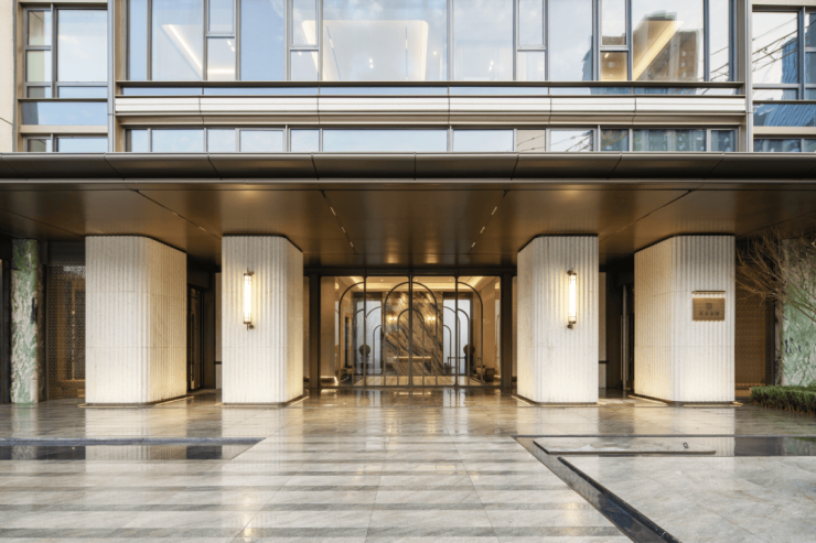 整体搭配香槟金铝板型材,基座采用深色石材,单元门厅采用维多利亚白石材及仿白金铝板,无一不凸显出项目的匠心和品质。