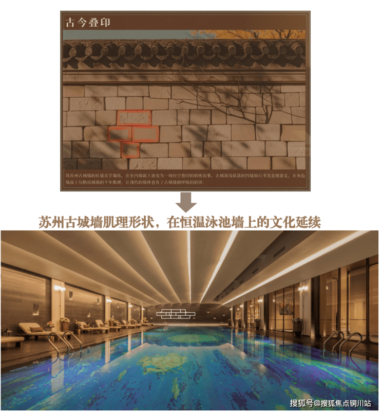 房观最喜欢的是恒温泳池极具灵性的中外文化碰撞:墙面以苏州古城墙为意象,池底则铺贴梵高《星月夜》图案,实现中西美学的融合对话。