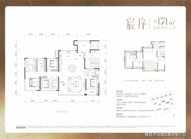 对于有大面积改善需求的购房者可关注建面约171㎡的奢适四房户型,四室两厅三卫空间格局,约19.5m面宽,套房次卧,动静分区,客餐厅以及瞰景阳台等累计约有61.2㎡的生活空间,另有步入式衣帽间+独立卫浴,彰显大宅气质。