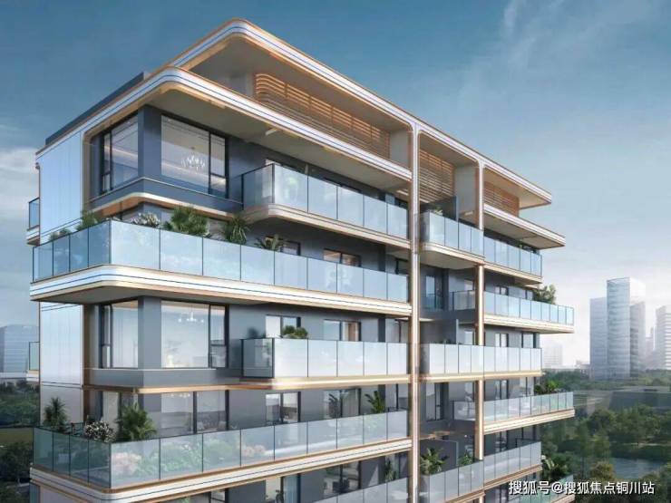 项目由 6 栋第四代洋房和 12 栋四层叠墅组成,洋房采用大面积香槟银铝板及玻璃幕墙,搭配香槟金色铝板作修饰,叠墅则以石材结合铝板立面,呈现出克制而纯粹的高级美学,整体布局采取西高东低的错落排布,使更多户型能够自然拥抱迪荡湖的秀丽景色。