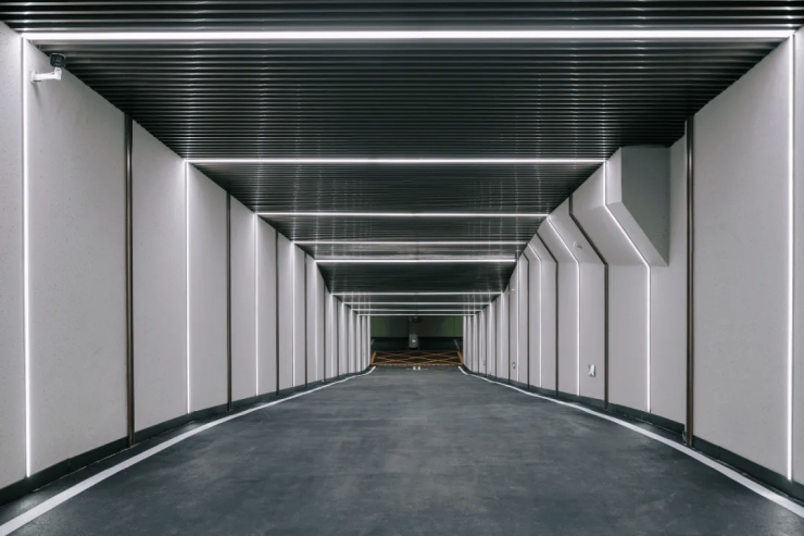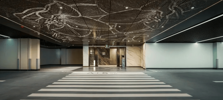 地下车库坡道全封闭精装,大堂天花板,同源劳斯莱斯创意的“星空顶”。