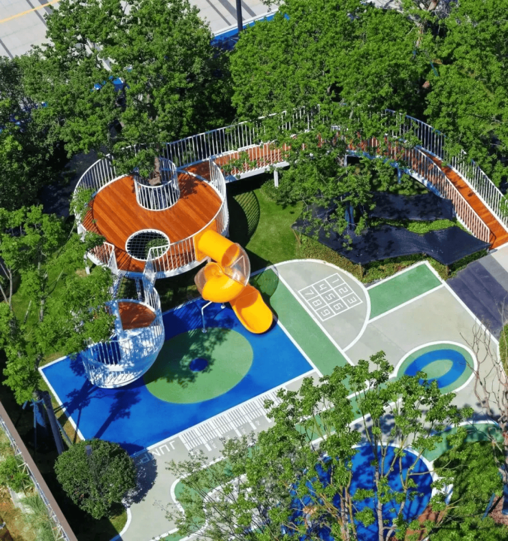 儿童活动区增加游玩设施,地面铺装,色彩活泼,景观层次感,一目了然。