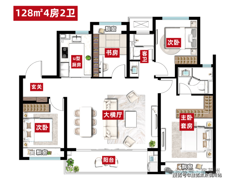 户型配置也非常纯粹,就建面约128/143㎡2个户型,全是大4房,高得房率。